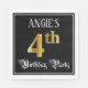 This opulent and luxurious birthday-themed paper napkin design features an editable name and the message “4th Birthday Party”. The large number “4th” has an imitation/faux gold-inspired coloring pattern, and the words “Birthday Party” are in fancy script-style text. The background is colored black by default (although it can be customized). Ornate, fancy paper napkins like this might be useful at a birthday party/celebration being held to honor somebody’s fourth birthday. [~Z0000565]