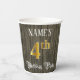 This opulent and fancy birthday-themed paper cup design features an editable name and the message “4th Birthday Party”. The large number “4th” features a faux/imitation gold-inspired coloring pattern, and the words “Birthday Party” are in ornate script-style text. The background has a faux/imitation woodgrain-inspired pattern. Luxurious, elegant paper cups like this might be useful to have at a birthday celebration being held to celebrate somebody’s fourth birthday. [~Z0000568]