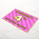The front of this joyful fourth birthday celebration foil invitation card design features an editable name, a large number “4th”, the message “BIRTHDAY PARTY!”, and a border. The background of the front has a loving pattern with dark pink and light pink stripes and heart shapes. The back features personalized details about the event, such as the date, time, venue, and any other useful information. Editable invitations like these might be a fun way to invite guests to a birthday party/gathering being held to honor somebody’s 4th birthday. [~Z0000603]