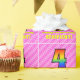This happy and cheerful 4th birthday themed wrapping paper design features a large number "4" having a colorful rainbow spectrum inspired gradient pattern. It also features the message "Happy 4th Birthday,", and a personalized name. The background features a dark pink and light pink stripes pattern containing loving pink heart shapes. Fun wrapping paper like this might be used when wrapping presents being given to somebody in celebration of their 4th birthday. [~Z0000415]