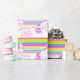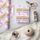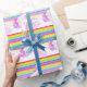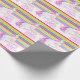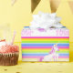 Unicorn watercolor rainbow stripe patterned four birthday wrapping paper. Personalize with your own name, currently reads Happy Birthday Taylor four. Cute whimsical chantering unicorn painting and design by Sarah Trett www.sarahtrett.com for www.mylittleeden.com on zazzle.