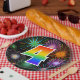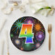 This colorful, cheerful, and fun paper plate design features a large number "4" containing a rainbow spectrum gradient inspired pattern. It also features a vibrant and exciting bursting celebratory fireworks inspired pattern. The background is colored black. Fun paper plates like this might be used at a celebration being held to honor somebody’s 4th birthday, a 4th anniversary, or some other 4th event. [~Z0000490]