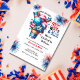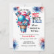 4th July gender reveal party invitation with an illustration of ice cream with blue and red scoops incorporating the American flag. A perfect design for a summer gender reveal. You can replace the details with your own and make this ice cream gender reveal to impress the guests on independence day.