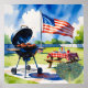 Get ready for a feast with this lively 4th of July poster! The watercolor style brings to life a backyard BBQ scene featuring a charcoal grill loaded with delicious burgers and hot dogs. A red-checkered picnic table awaits, and the American flag waves majestically under a sunny summer sky. Bold "4th of July BBQ Celebration" text in red, white, and blue font adds to the festive atmosphere. This 1600x1600px design is perfect for inviting guests or simply sprucing up your space for the holiday!