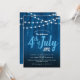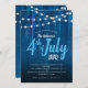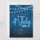 This 4th of July BBQ party invitation features and rustic dark blue wood background accented with strings of lights across the top. This is perfect for your family backyard Fourth of July party.