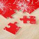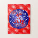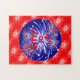 A fun 4th of July puzzle covered with red and white fireworks, deep blue circle on a bright red background.