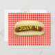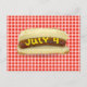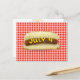 Hot dog on red and white gingham for 4th of July BBQ party invite.