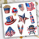 4th of July Set 1 Stickers. © Pick a Sticker. This sheet of 4th of July, Independence Day, stickers include: popcorn; ice cream; ice block; USA flag; hat; cape; fireworks; star; bottle and a BBQ.
