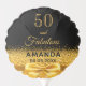 Elegant, classic, glamorous and feminine style balloon for a 50th birthday party. A gold colored ribbon and bow with faux golden glitter and sparkle, a bit of bling and luxury. Black background. With the text: 50 and Fabulous. Templates for name and a date.
