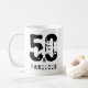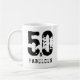 Trendy cool 50 and fabulous popular theme mug variant for young spirits at any age.Simple minimalist black and white gift for a casual relaxed birthday party.Sporty modern look..You can customize personalize it with your name or delete the text if you wish.Also you can change the number with your specific celebration age,if it is not 50.