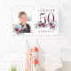Elegant feminine 50 and fabulous birthday party photo and name personalized banner with watercolor red burgundy, dusty blue roses bouquets, and a modern trendy typography script.