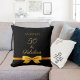 A pillow as a gift for a woman's 50th birthday. An elegant black background, decorated with a faux gold bow and ribbon. With the text: 50 and fabulous. Template for her name. Golden letters.