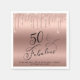Elegant and chic personalized 50th birthday party napkins featuring "50 & Fabulous" written in a stylish script against a rose gold faux foil background, with rose gold faux glitter dripping from the top. You can personalize with her name and date of the party.