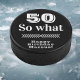Personalized 50 so what Funny Quote 50th Birthday Hockey Puck. A funny and inspirational saying 50 so what in modern black typography. Perfect for a person with a sense of humor. You can change the age and name.