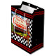 Medium black glossy gift bag with an image, on the front, of a 50s retro diner sign that reads, “Thank you for coming,” a red diner clock, and a vintage 50s female server on a black and white checkerboard. Double red stripe borders encircle the bag. See the entire Nifty 50s Gift Bag collection in the PARTY FAVORS section.