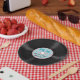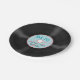 Fun 50's retro style paper plates, with graphics of a vinyl LP record look. The label part of the record is done in pink and blue with blue graphic text reading Sock Hop and pink musical notes. Personalize the black text for your special event.