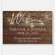 Glowing gold lanterns and light string with welcome sign on dark brown rustic wood for 50th anniversary.