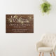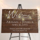 Glowing gold lanterns and light string with welcome sign on dark brown rustic wood for 50th anniversary.