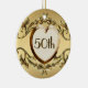 Beautiful and elegant 50th Anniversary or 50th Birthday elegant popular round shape ceramic ornament in gold. In the middle is a gold heart with "50th" in a stylish matching gold script. Realistic gold leaf borders give a vintage look (printed design, not real gold) on the top and bottom of this special ornament for that special occasion. Makes a lovely party keepsake favor for your guests as well as the fiftieth couple or 50th birthday men or women. Easily add any name or names and special date to further customize on the back, or just delete the sample if not needed.