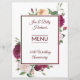 Celebrate a special couple's "50th Wedding Anniversary" with this bold, burgundy and white, floral "Reception Menu Card". To personalize, simply insert your text into our easy template. Be sure to view the complete set of matching accessories for this "50th Wedding Anniversary Collection". Enjoy! (Note the number 50 can be changed by simply selecting and entering another number.)