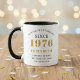 Personalized birthday mug for those born in 1976. Easily customize the text to the front and the interior of this birthday coffee mug using the template provided. Part of the setting standards range of designs.