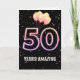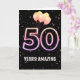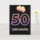 Party balloons and confetti on black background with the neon number 50 for a 50th birthday.