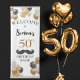 A 50th Birthday Bash Party Banner, designed with a man's mustache, black and gold colored balloons and highlights on a white background. The sign reads: WELCOME To, Name, 50th Birthday Bash. To personalize with a name, simply replacing sample text with your own. The age (50) can also be replaced with any number within the template.