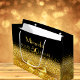 Elegant, classic, glamorous and feminine style party gift bag. A gold colored ribbon and bow with golden glitter and sparkle, a bit of bling and luxury for a birthday. Black background. With templates for name, age, date of birth and date of anniversay.