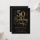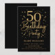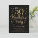 50th birthday party invitation in black and gold. Trendy modern design, perfect for a stylish men's or women's bday celebration. Features script font and confetti. Customize with your own details. Printed Zazzle invitations or instant download digital printable template.