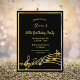 A trendy, modern 50th birthday party invitation card for both men and women. A classic black background, with faux gold frame and music notes, golden colored letters. Templates for your party information. Back: white background.