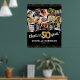 Elegant 50th birthday party poster featuring a stylish black background that can be changed to any color, a 15 photo collage through the years, the saying 'cheers to 50 years', gold glitter edges, their name, and the date of the celebration.