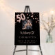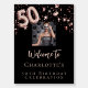 A welcome board for a glamorous 50th birthday party. A classic black background decorated with rose gold stars. Personalize and add a photo and name. Number 50 is written with a balloon style font.