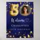 A welcome poster for a 50th birthday party. A navy blue background with elegant faux gold stars. The blue color is uneven. Personalize and add a photo, name and text. White letters.