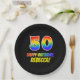 This cheerful, fun, and colorful birthday paper plate design features a large number "50" and the message "HAPPY BIRTHDAY,", both colored with a rainbow spectrum gradient inspired pattern, along with a bold yellow customizable name. It has a black colored background. Fun, editable paper plates like this might be used at a celebration being held to honor somebody’s fiftieth birthday. [~Z0000488]