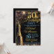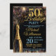 A stylish 50th Birthday Party Invitation featuring a bottle of bubbly in gold, fireworks with gold and blue text all on a black background . A gorgeous invitation to send to family and friends to celebrate a special birthday. All text can be amended as needed - more text can be added on the back or delete the text box if need needed.