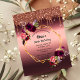 On front: An invitation for a 50th birthday party. A burgundy colored faux metallic looking background with a faux gold geometric frame. Decorated with dark purple and burgundy flowers, roses and boho style feathers. Faux copper glitter drip. Templates for a name and party details. The name is written with a hand lettered style script, black and pink colored letters.