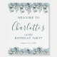 Welcome your guests with this elegant birthday party welcome sign. Pretty dusty blue roses, peonies and wildflowers decorate the top and border. A classic and easy-to-read font combination takes only minutes to personalize.
