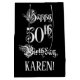 This elaborate and fancy birthday giftbag design features the message “Happy 50th Birthday,” in lavish script style text, on a black colored background. It also has a customizable recipient name. A gift bag like this might be used when wrapping gifts being given to somebody in celebration of their 50th birthday. [~Z0000557]