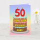 This upbeat and cheerful birthday themed greeting card design features a cartoon-style depiction of a three-tier birthday cake having number-shaped candles on top showing the age “50“, along with the message “HAPPY 50TH BIRTHDAY,”, and an editable recipient name. The background of the front features a multicolored pastel rainbow spectrum inspired gradient pattern. The inside has a customized birthday greeting message, or could perhaps be cleared and left blank if a message is to be written by hand instead. A fun, personalized birthday greeting card like this might be used to celebrate somebody’s fiftieth birthday. [~Z0000625]