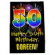 This colorful, exciting, and fun birthday giftbag design features a large number "50" with a rainbow spectrum gradient inspired pattern, along with the message "Happy 50th Birthday,", and an editable recipient name. It also features a colorful background pattern inspired by bursting celebratory fireworks. A gift bag like this might be used when giving a gift or present in honor of somebody’s 50th birthday. [~Z0000509]