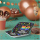 This cheerful and joyful birthday paper plate design features a large number “50” having a rainbow spectrum gradient inspired pattern. It also features the message “Happy 50th Birthday,”, and a custom name. The background features a vibrant and colorful pattern inspired by a field of stars. Exciting birthday themed paper plates like this might be used at a party in celebration of somebody’s fiftieth birthday. [~Z0000582]