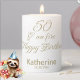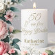 Celebrate her golden milestone with this elegant gold on white 50th birthday candle! Featuring the phrase "50 & on Fire Happy Birthday" in a flowery gold font, above the honoree’s name and date of birth in a contrasting font, this delightful gift offers a soft glow perfect for commemorating half a century of brilliance. The date line can be deleted if you wish.