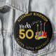Custom Rocks 50 gold modern typography 50th birthday button with musical notes and three cool psychedelic colorful guitar designs on black background. Electric guitar, acoustic guitar and acoustic guitar art illustration in vibrant colors. This easy to use template to change the age and name creates the perfect party button badge to celebrate fifty in rock n roll style and is ideal for a guitarist, musician and music lovers. This cool modern musical instrument design celebrates the music energy of this wonderful musical instrument and is the perfect way to rock a fiftieth birthday celebration. Original artwork by artist Catherine Sweetman