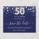 A girly and trendy Save the Date card for a 50th birthday party. A navy blue colored background. Decorated with faux silver stars. The text: Save the Date is written with a large trendy hand lettered style script. Number 50 is written with a balloon style font.