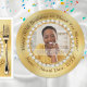 50th Birthday Paper Plates, Personalized or ANY OCCASION or YEAR. 3 Sizes, Round or Square. Gorgeous shades of Gold Glitter and Silver Glitter and Pearl Designs surround her, Photo Birthday Plates. You can DELETE the Photo Template to Expose a Stunning, Number Golden and Diamond "50" Design and Golden Diamond, beautifully custom printed on Paper Plates or TRANSFER to 1000 other 50th birthday party supplies, decorations, gifts and more.