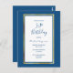 On front: A classic blue background with a faux gold and white frame. Simple and elegant! Templates for a name and party details. The name and the text: 50th Birthday are written with a hand lettered style script, blue colored letters. Perfect for a winter or spring birthday party!