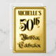 The front of this elaborate fiftieth birthday celebration foil invitation card design features the message “50th Birthday Celebration” in opulent script-style text. It also features a custom name. The back features personalized details about the event, such as the date, time, venue, and any other information that may be useful. Fancy, luxurious, customized invitations like these might be used to invite guests to a birthday party/celebration being held to celebrate somebody’s fiftieth birthday. [~Z0000596]