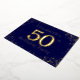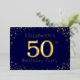 50th birthday party invitation. Personalize with the name of the person of honor. The number 50 in large sparkle style font. Framed in falling golden dots. Set on a very saturated dark cold blue. Enter the party details on the back of the invitation using the templates, also sent on dark blue framed in diamonds.