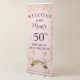 A 50th Birthday Party Banner for Mom, designed on a soft pink background with gold colored highlights, and decorative hearts. The text includes: WELCOME To Our MOM's 50th Birthday Celebration. To personalize, simply insert your text into our easy template, replacing the sample text. The number 50 can be changed to any number. The text: Mom can be changed to Grandma or your preferred text.