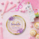 A feminine, girly and chic paper plate for a 50th birthday party. Glamorous with elegant and modern with a soft rose gold, blush pink gradient backdrop. With faux gold frames, and ultra violet and purple colored watercolored flowers and golden confetti rain. Templates for name, age and date. Purple and golden colored letters.